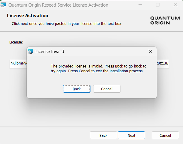 If either of the below errors are seen then the license entered is not valid. Please try again, ensuring the license is all on one line, with no line breaks. If the issue persists please reach out to our support team at origin-support@quantinuum.com
