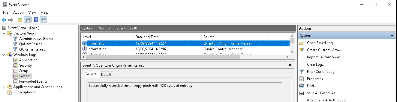 To confirm proper operation of the kernel mode component one can check the in the System panel of the Windows Event Viewer and filter for the log source Quantum Origin Kernel Reseed. Successful operation is indicated by a Successfully reseeded the entropy pools with 128 bytes of entropy log in the System Log.
