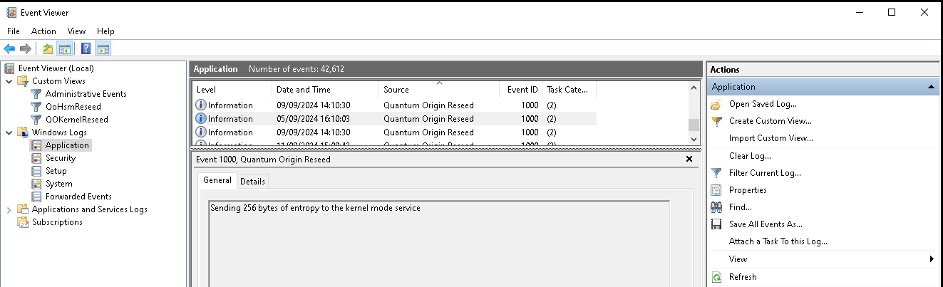 To confirm proper operation of the user mode component one can check the in the Application panel of the Windows Event Viewer and filter for the log source Quantum Origin Reseed.
